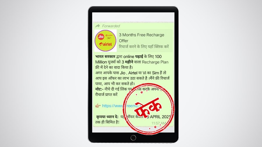 वॉट्सऐप पर वायरल मैसेज जिसका दावा ५५५ रूपए वाला मुफ्त जिओ रि...