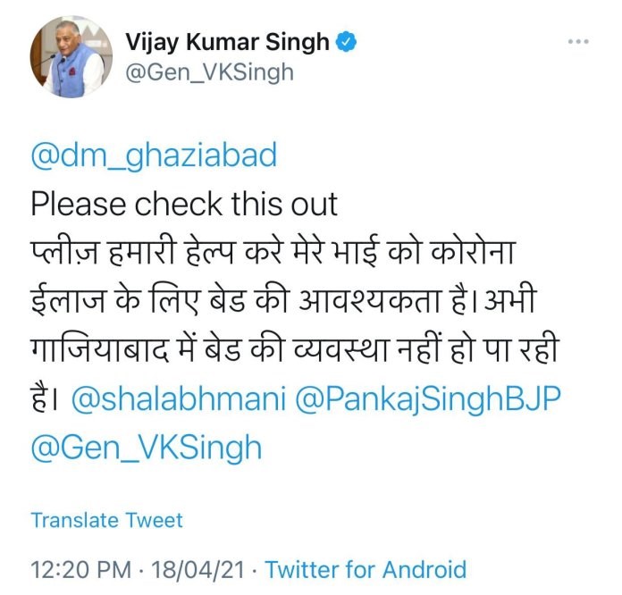 अपने भाई के लिए ट्वीट कर क्या सांसद वीके सिंह ने बेड मांगा? ...